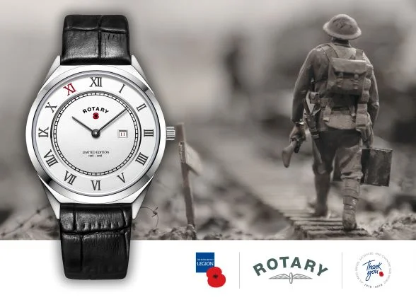 Rotary Watches arrived in the UK in 1915 whilst WW1 was gathering momentum. The wrist watch as we know it was created during this conflict and Rotary Watches were amongst its first early adopters. 2018, being the Centenary of the End of the First World War and the signing of the Armistice, provided a great opportunity we felt for both Rotary Watches and The Royal British Legion to work together in a mutually beneficial partnership, we conceived the idea of a Rotary commemorative wrist watch to mark the anniversary we were delighted when not only was our idea well received but marvellously brought to life. Here you can see the photo of the Rotary and The Royal British Legion Official Commemorative Watch marking the 100th anniversary of the end of the First World War with only 1918 watches being made. PMA Marketing are proud to have created this prestigious partnership.